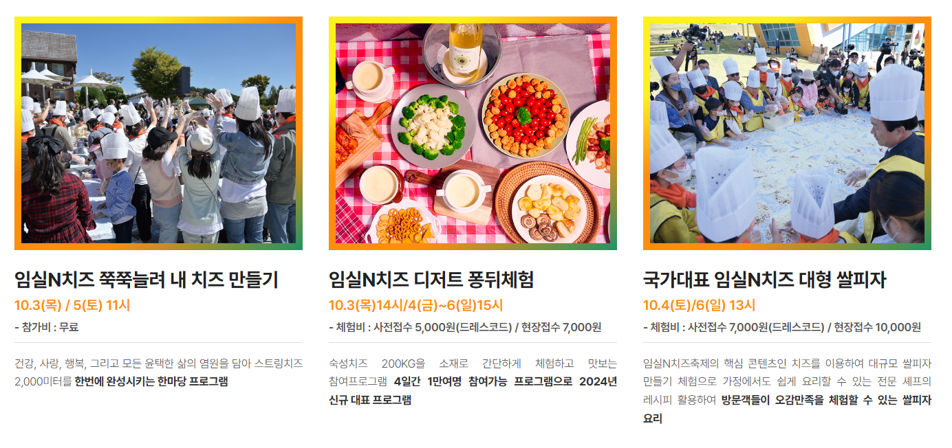 임실치즈축제에는 정말 다양한 프로그램들이 진행될 예정이에요. 10가지 테마에 무료 70개의 프로그램이라니 어마어마하지 않나요. 위의 세 가지 메인 프로그램을 필두로 아주 다양한 프로그램들이 많으니, 다양한 공연과 먹거리를 만나는 시간을 가질 수 있을 거예요. 특히 아이들을 위한 어린이 인형극, 뮤직 페스티벌, 유럽 의상 코스프레 체험 등도 있어서 온 가족이 함께 즐기기에 좋습니다. 또, 밤에는 드론 라이트쇼와 퍼레이드 같은 화려한 공연이 준비되어 있습니다.