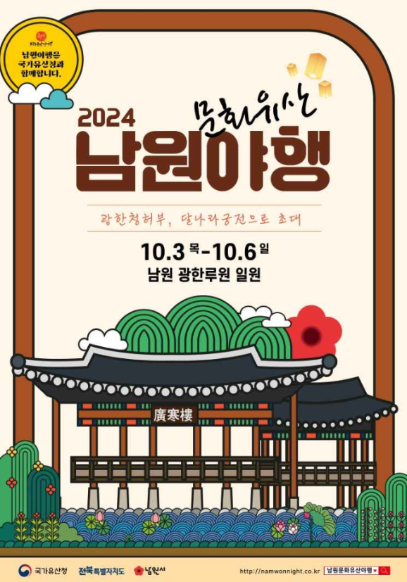현재의 광한루는 황희가 짓고 광통루라고 이름지었는데 후에 정인지가 달나라의 궁전인 광한청허부를 닮았다 하여 광한루라 부르게 되었다. 2024년 10월 3일부터 6일까지 4일간 펼쳐지는 2024 남원문화유산야행은 “광한청허부, 달나라궁전으로 초대”라는 주제를 가지고 옥황상제와 견우직녀의 이야기를 풀어낼 예정이다. 소원을 담아 하늘에 날려보는 ‘월궁 천등날리기’, 아름다운 불꽃이 내리는 ‘월궁 낙화놀이’ 그리고 다양한 체험과 야간경관조명으로 가득한 환상적인 월궁으로 여행을 떠나보자.